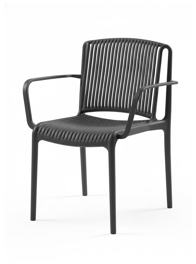 Esta silla está fabricada en polipropileno reforzado con fibra de vidrio en color antracita, ofreciendo resistencia, ligereza y durabilidad. Su diseño de líneas modernas y estructura sin uniones visibles la convierte en una opción ideal para restaurantes, cafeterías y terrazas, tanto en interiores como en exteriores. Cuenta con reposabrazos integrados, que mejoran la comodidad del usuario sin comprometer la facilidad de manejo. El respaldo y asiento con entramado de líneas abiertas favorecen la ventilación y aportan un diseño elegante y funcional. Con unas dimensiones de 56 cm de ancho, 49 cm de fondo y 82 cm de alto, su diseño apilable permite optimizar el espacio y facilitar el almacenamiento, siendo ideal para negocios con alta rotación de clientes. Una opción versátil, ergonómica y fácil de mantener, perfecta para establecimientos que buscan mobiliario cómodo, resistente y con un estilo contemporáneo.