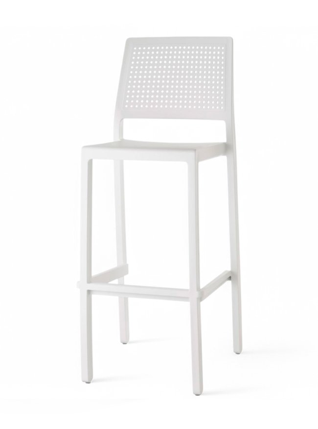 Taburete de bar de la colección Mercer con estructura de aluminio. A la estructura de aluminio la envuelve, por todo el respaldo, una preciosa cinta sintética. Además, ofrece dos cojines, uno en el asiento y otro en el respaldo de 5 cm de grosor realzando los colores del sillón proporcionándole elegancia. El sillón es apilable por lo que ahorra mucho espacio a la hora de guardarlas.