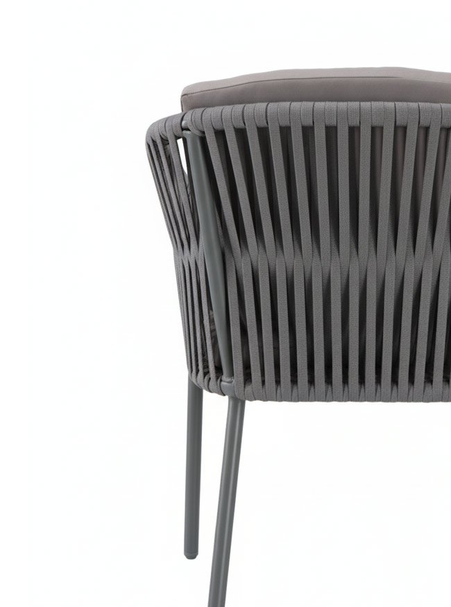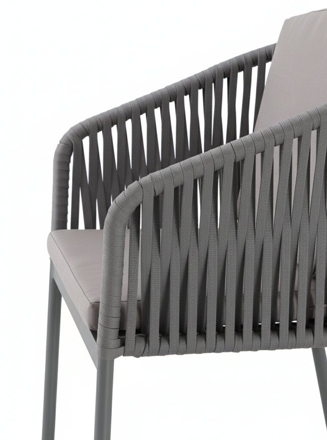Taburete de bar de la colección Mercer con estructura de aluminio. A la estructura de aluminio la envuelve, por todo el respaldo, una preciosa cinta sintética. Además, ofrece dos cojines, uno en el asiento y otro en el respaldo de 5 cm de grosor realzando los colores del sillón proporcionándole elegancia. El sillón es apilable por lo que ahorra mucho espacio a la hora de guardarlas.