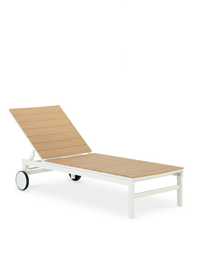 Tumbona perfecta para espacios exteriores y áreas de hostelería, gracias a su diseño moderno y materiales de alta calidad. La estructura de aluminio blanco asegura ligereza y resistencia a la intemperie, mientras que las lamas de polywood, un innovador material que imita la madera natural pero fabricado a base de polímeros, aportan un toque cálido y natural con la ventaja de un mantenimiento sencillo y durabilidad excepcional. La tumbona está equipada con un respaldo abatible, permitiendo ajustar múltiples posiciones para garantizar el máximo confort, ya sea para relajarse al sol, leer o descansar. Sus ruedas integradas facilitan el desplazamiento, añadiendo practicidad a su diseño. Con unas medidas de 195x65x36 cm, esta tumbona combina estilo y funcionalidad, adaptándose perfectamente a terrazas, jardines o zonas de piscina. Su diseño en tonos naturales crea una atmósfera acogedora y sofisticada, ideal para realzar cualquier espacio exterior.
